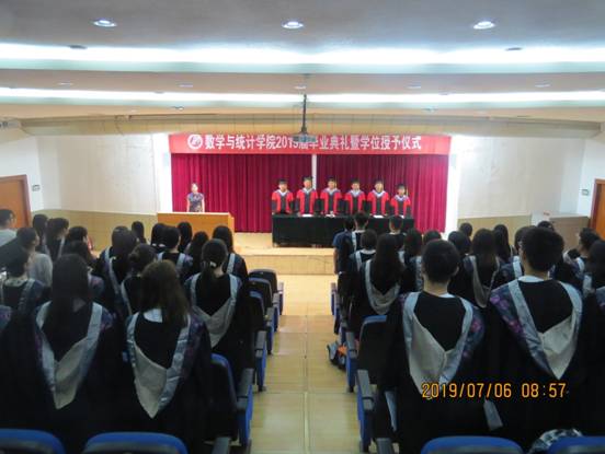 7月6日上午9点,2019届毕业典礼暨学士学位授予仪式在一号教学楼六楼报告厅隆重举行。太阳成集团tyc151cc经理汪义瑞、党总支书记郭全寿、副经理成波、王昭海;院办公室主任何晓燕、院学工办主任马新华、教师代表赵临龙、李善明等多位老师以及2015级统计学、数学与应用数学专业全体毕业生共同出席本次毕业典礼。毕业典礼由公司党总支书记郭全寿主持。