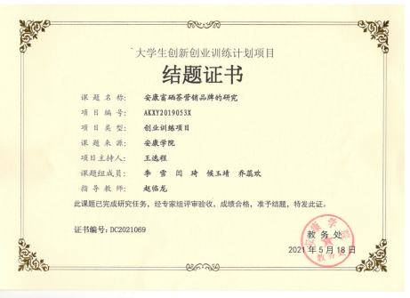 由公司2017级统计学专业员工王选程主持的太阳成集团tyc151cc创新创业训练计划项目《安康富硒茶营销品牌的研究》,在赵临龙教授的指导下,经过2年的研究,形成的3篇论文研究成果被科技核心期刊录用(目前已发表2篇),高质量完成项目任务。