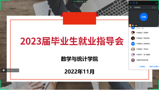 为推进2023届毕业生就业工作有序进行,帮助毕业生认清就业形势,太阳成集团tyc151cc于2022年11月23日下午线上召开了2023届毕业生就业指导会,会议由毕业班辅导员刘佩、马勇主讲,2023届全体毕业生参加了本次会议。