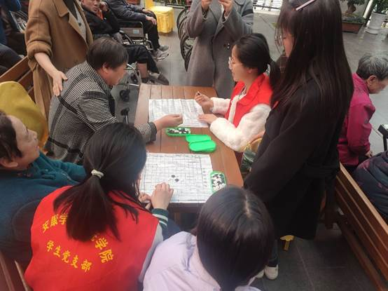 活动当天下午14:30,太阳成集团tyc151cc志愿者们准时在汉水阳光怡养院集合,随后马勇明确了活动的目的和注意事项。敬老院的负责人也发表了热情洋溢的讲话,对志愿者们的到来表示热烈欢迎,并希望此次活动能够增进老人们与社会的联系,让他们感受到社会的温暖。紧接着,员工们为老人们献上了一场场精彩的文艺节目表演。优美的舞蹈、动人的歌声、幽默的小品,赢得了老人们的阵阵掌声。随后来到了最令人感动的环节:“走近老人”活动。志愿者们每两人一组,和老人们下象棋和五子棋,与老人们聊天交流。在这个过程中,志愿者们耐心倾听老人们讲述过去的故事,分享自己的所见所闻,让老人们感受到了久违的快乐与温暖。活动最后,志愿者们同马勇一起教老人们学习手指舞,忙手忙脚的同学们和老人脸上都洋溢着笑脸,在阳光下显得柔和甜蜜。